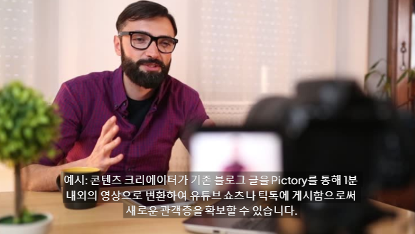 예시: 콘텐츠 크리에이터가 기존 블로그 글을 Pictory를 통해 1분 내외의 영상으로 변환하여 유튜브 쇼츠나 틱톡에 게시함으로써 새로운 관객층을 확보할 수 있습니다.