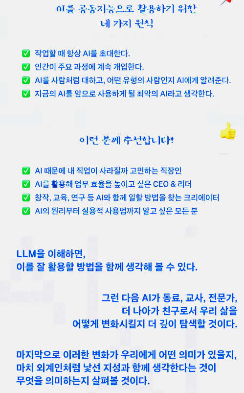 마지막으로, AI에 대한 지식이 전혀 없는 사람부터 어느 정도 배경 지식이 있는 사람까지 모두에게 유익한 정보를 담고 있습니다. 복잡한 이론을 쉽게 풀어내어 독자들이 AI와 함께 일하는 미래를 구체적으로 그려볼 수 있게 도와줍니다. AI 기술을 잘 활용하는 방법을 배우고 싶은 사람들에게 강력히 추천할 수 있는 책입니다.