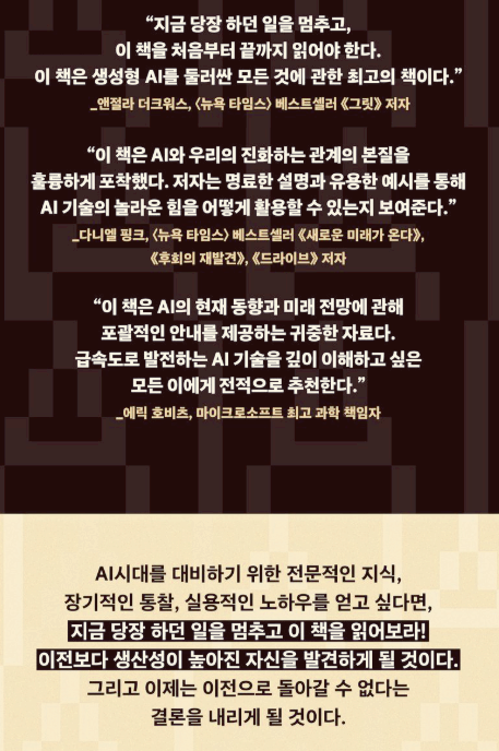 마지막으로, AI에 대한 지식이 전혀 없는 사람부터 어느 정도 배경 지식이 있는 사람까지 모두에게 유익한 정보를 담고 있습니다. 복잡한 이론을 쉽게 풀어내어 독자들이 AI와 함께 일하는 미래를 구체적으로 그려볼 수 있게 도와줍니다. AI 기술을 잘 활용하는 방법을 배우고 싶은 사람들에게 강력히 추천할 수 있는 책입니다.