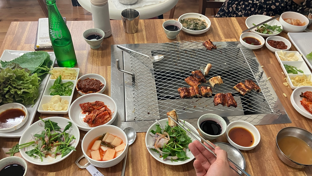 1kg 반반(양념,소금)으로 시켜서 먹었어요. 처음에 보자마자 못참겠어서 사진도 안 찍고 한입 먹어봤죠. 영롱하고 황홀했습니다. 그러다 정신이 들어 사진을 찍었어요. 상추와 깻잎에 소스 찍은 장어 하나 올리고, 생강 조금, 마늘과 고추 쌈장 찍어서 올리고 싸먹으면 GOAT 극락행.
