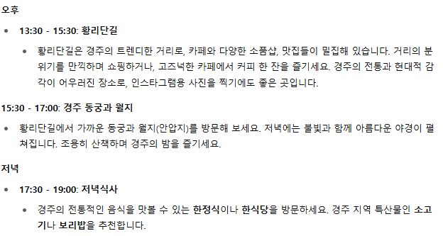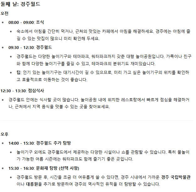 “경주 1박 2일 여행 계획 짜줘. 첫날은 불국사랑 황리단길 가고 싶고, 둘째 날은 경주월드 가고 싶어.”