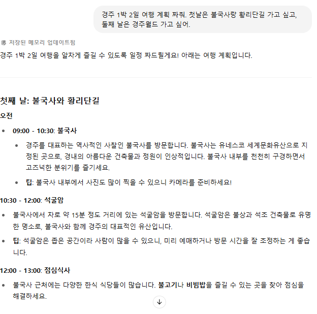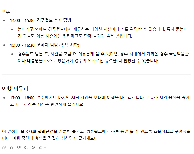 “경주 1박 2일 여행 계획 짜줘. 첫날은 불국사랑 황리단길 가고 싶고, 둘째 날은 경주월드 가고 싶어.”